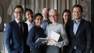 Mixed-gender workplace picture showing employees standing in office together, posing for a picture - Source: Shutterstock.