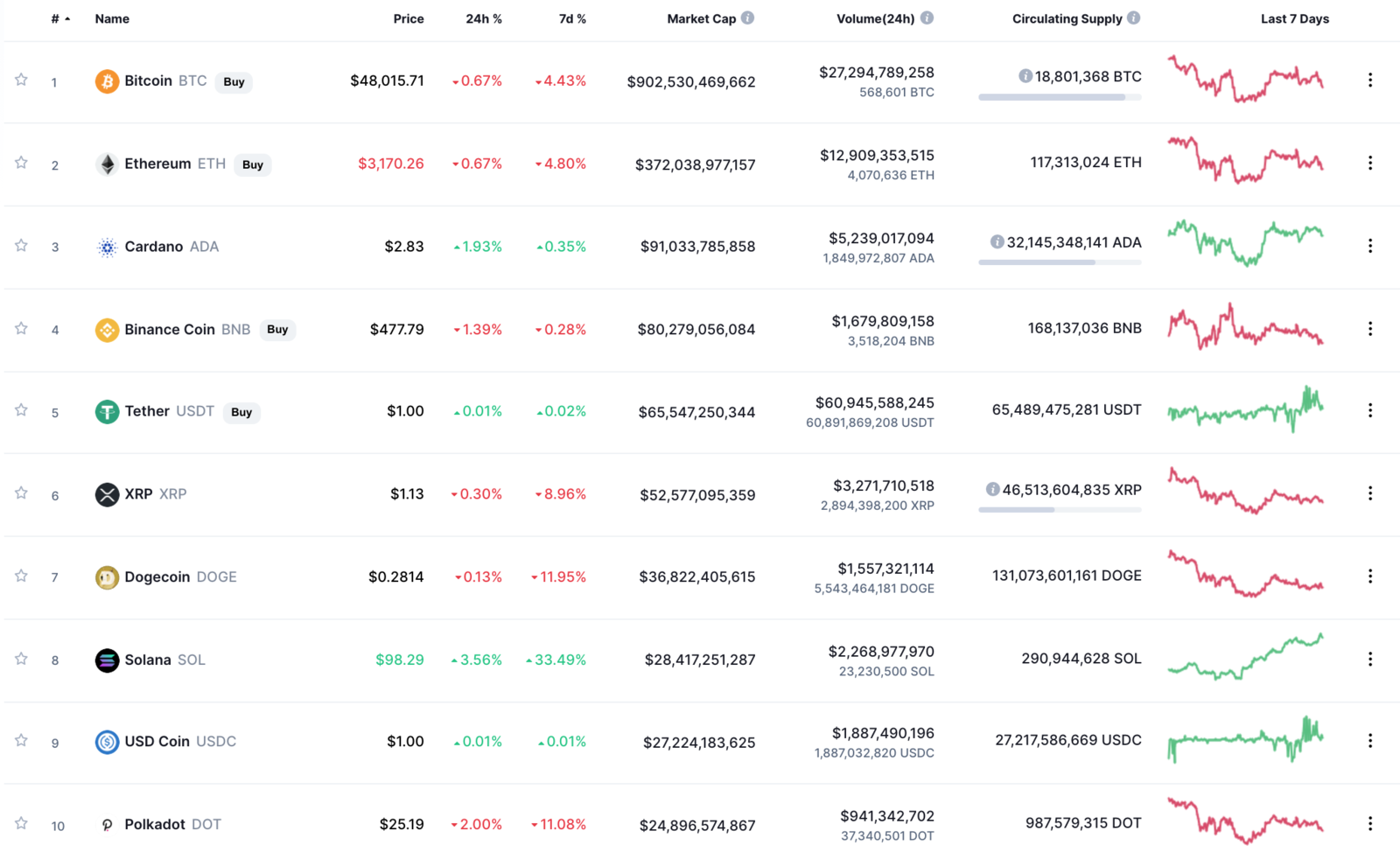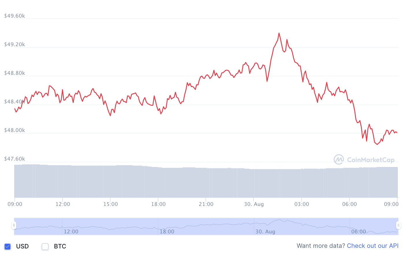 Bitcoin's price at time of writing was $48,025.18. Bitcoin’s dominance is currently 43.65%, a decrease of 1.27% over the day.