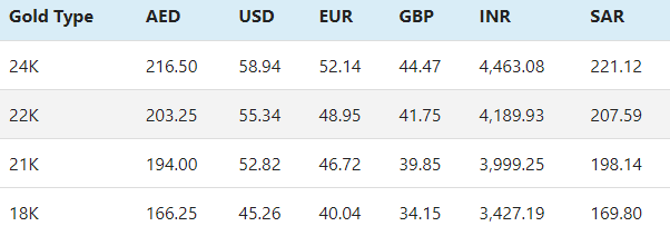 In the UAE, 24K was trading at Dh216.50 per gram at the opening of the market (10 grams = Dh2165.0) while 22K was trading at Dh203.25, 21K at Dh194.00, and 18K at Dh166.25 per gram. Rates were last updated on Monday 13th of December 2021 at 6:01AM GMT.