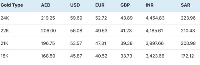 Gold prices in Dubai today were down this morning with 24K trading at Dh219.25 per gram at the time of writing.