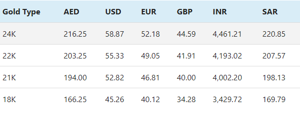 Gold Rate in Dubai - US Dollar, Euro, British Pound, Indian Rupee, and Saudi Riyal