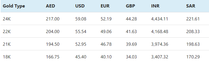 In the UAE, 24K was trading at Dh217 per gram at the opening of the market (10 grams = Dh2170) while 22K was trading at Dh204, 21K at Dh194.50, and 18K at Dh166.75 per gram. Rates were last updated on Sunday 28th of November 2021 at 6:01AM GMT.
