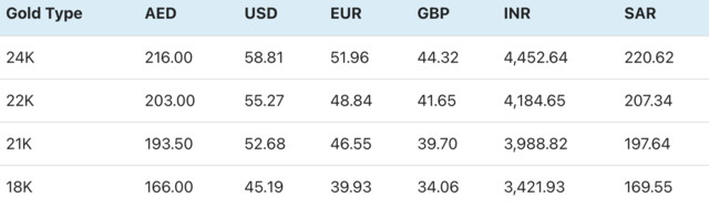 In the UAE, 24K was trading at Dh216.00 per gram at the opening of the market (10 grams = Dh2160.0) while 22K was trading at Dh203.00, 21K at Dh193.50, and 18K at Dh166.00 per gram. Rates were last updated on Sunday 12th of December 2021 at 5:01AM GMT.