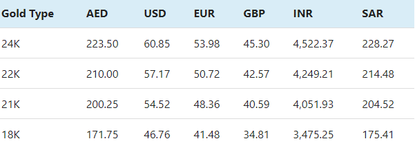 In the UAE, 24K was trading at Dh223.50 per gram at the opening of the market (10 grams = Dh2235) while 22K was trading at Dh210, 21K at Dh200.25, and 18K at Dh171.75 per gram. Rates were last updated on Monday 22nd of November 2021 at 5:01AM GMT.