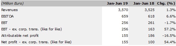 Revenues in the first half amounted to €3.57 billion (+1.3%), with solid growth both in Energy (+1.2%) and Infrastructure (+5.8%).