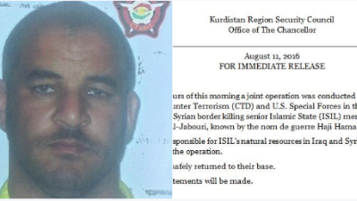 The Security Council for the semiautonomous Kurdistan Regional Government said its counter-terrorism forces, with the help of U.S. Special Forces, conducted an operation near the Iraqi border with Syria that left Sami Jassim Mohammed al-Jabouri, known also as Haji Hamad, dead. The Kurdish government identified him as a senior member of the group calling itself the Islamic State -- also identified as Daesh, ISIL and ISIS.