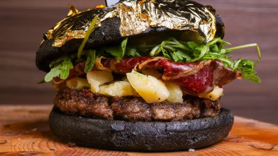 Artisanal black sandwich filled with meat burgers, aged pecorino cheese, bresaola and rocket, garnished with gold leaf and served in a grill (Shutterstock)