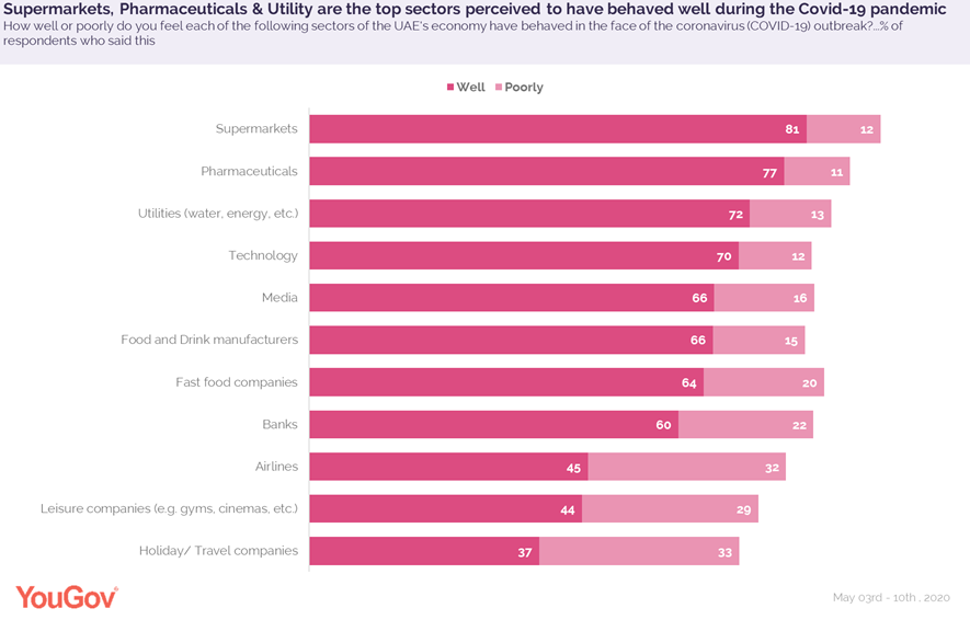 When asked about the behaviour of various sectors within the UAE economy in response to the pandemic, residents were more likely to say all the sectors have behaved well rather than poorly.