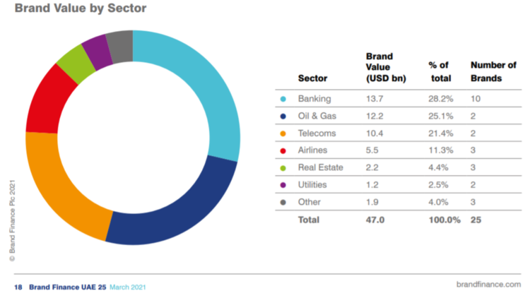 The air travel sector was probably amongst the hardest hit in 2020, thanks to travel bands imposed in most countries around the globe. Despite a 30.9% drop, Emirates remained the third-highest UAE brand in terms of value, which is estimated by $4,669 million for 2021.