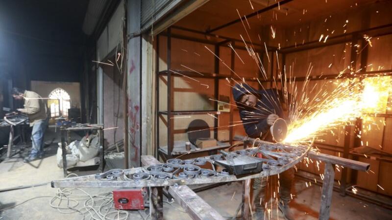 Diyaa al-Issa, 38, wears a white helmet and uniform as he works on renovating a massive gate in the market.