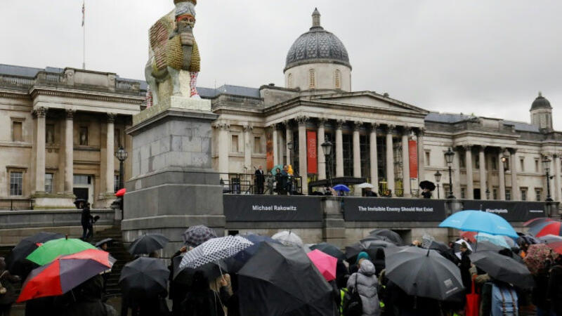 A reconstruction, made from date-syrup cans, of an ancient Iraqi statue destroyed by ISIS terrorists was unveiled in London’s Trafalgar Square, Wednesday.