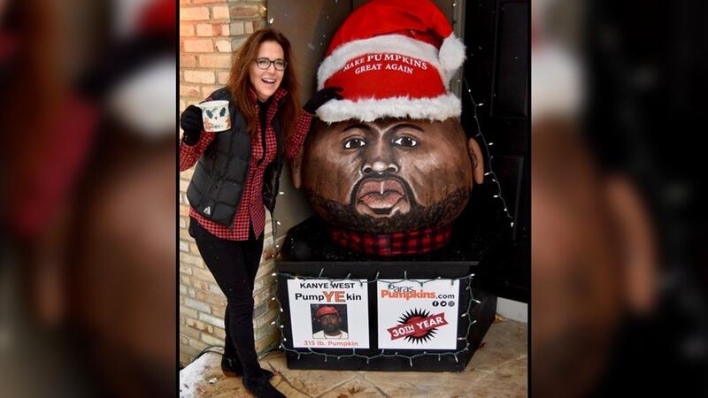 An Ohio pumpkin artist turned some autumn art festive when she transformed a giant Kanye West pumpkin into a Christmas decoration.