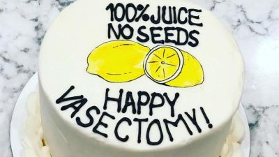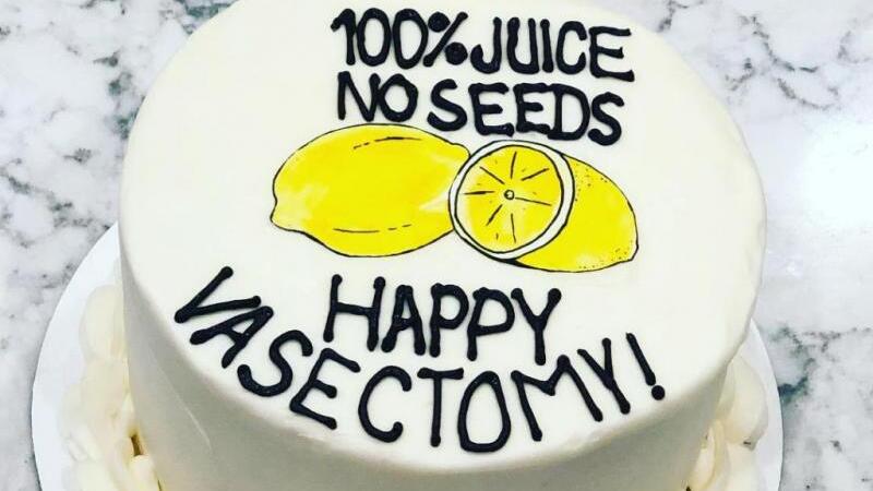 The cake, which depicts a pair of lemons, reads: "100% JUICE, NO SEEDS. HAPPY VASECTOMY!"