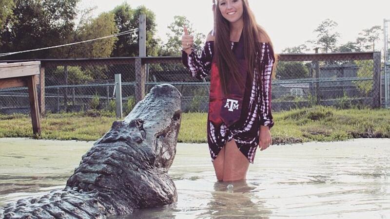 Texas A&M senior featured an unusual guest in her graduation photos: a 1,000 pound alligator.