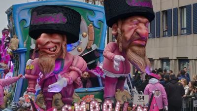 The float in question is titled “Shabbat Year” and was prepared by the Vismooil’n carnival group. It featured two giant puppets with sidelocks and streimels, hats worn by some Orthodox Jews on Shabbat and Jewish festivals, in pink suits. One is grinning while smoking a cigar. That puppet has a white rat on his right shoulder. Both puppets are standing on gold coins and have money bags at their feet.