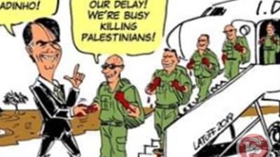 Latuff's latest caricature showed Israeli soldiers getting off a plane with their hands covered in blood as Brazilian President Jair Bolsonaro greets them. In the caricature, the soldiers with a grin on their faces, tell Bolsonaro, "Sorry for our delay! We're busy killing Palestinians."