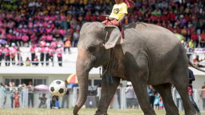 A herd of elephants wearing the colors of teams set to participate in the World Cup played a round of soccer against a team of students in Thailand.