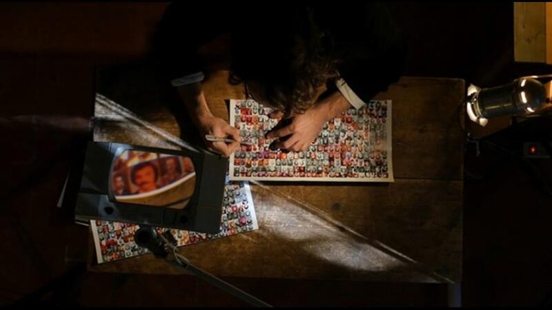 As he sits over a light table working with headshots of disappeared individuals (compiled by Umam Documentation and Research for its 2010 volume “Missing”), Halwani’s voiceover ruminates over how survivors find it easier to recall individuals when their photos are included among the ranks of the missing than when looking at individual portraits.