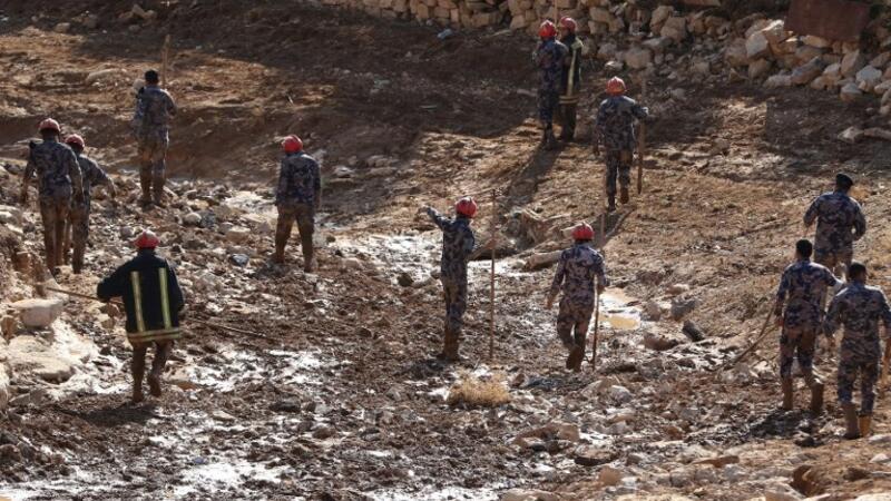 Jordanian rescue teams search for missing persons following flash floods in the city of Madaba near the capital Amman on November 10, 2018. ()