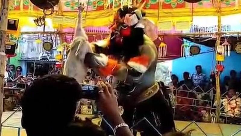 The bizarre performance was filmed during a jatra performance, which is a traditional folk theatre popular in many states of India.