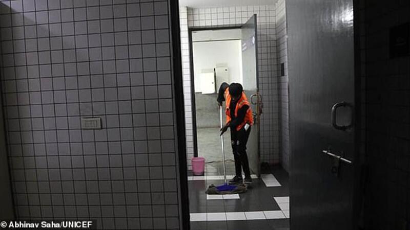 A 13-year-old boy has been pictured cleaning toilets inside the stadium where UNICEF'S World Children's Day celebrations were taking place.