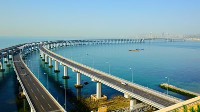 The structure is supported by three cable-stayed bridges and designed to withstand winds of up to 340km/hour. In addition, a 6.7km undersea tunnel has been built to avoid disrupting shipping lanes, connected by two artificial islands.