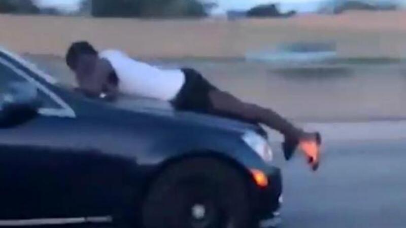 In video of the incident recorded by Daniel Midah, who was driving next to the open-air passenger, the man is lying on the hood of the car, which was going around 70 mph. He holds on with one hand and talks on his cell phone with his other hand.