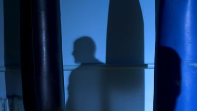 Behind the apartment’s curtain, a tough guy is boxing, enough to make any passing criminal think twice before breaking in.