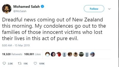 Mohamed Salah has condemned the mosque attacks in New Zealand that have claimed the lives of 49 people and left 48 injured.