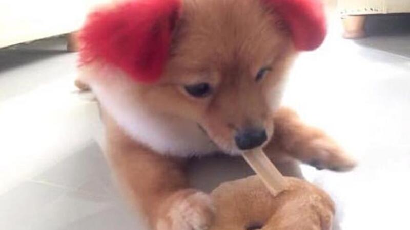 A dog owner has been slammed after she tried to dye her pet's ears bright red - and one of them dropped off.