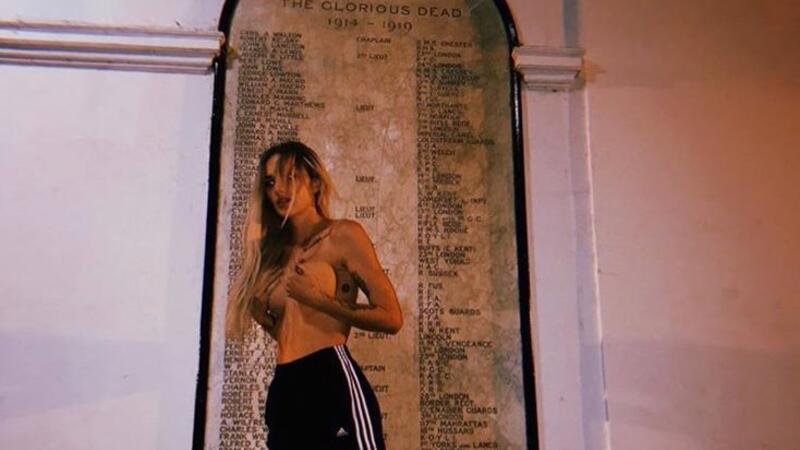 They show the 31-year-old, whose real name is Lauren Henson, posing in front of a plaque honouring soldiers who served in the First World War with her hands covering her breasts.