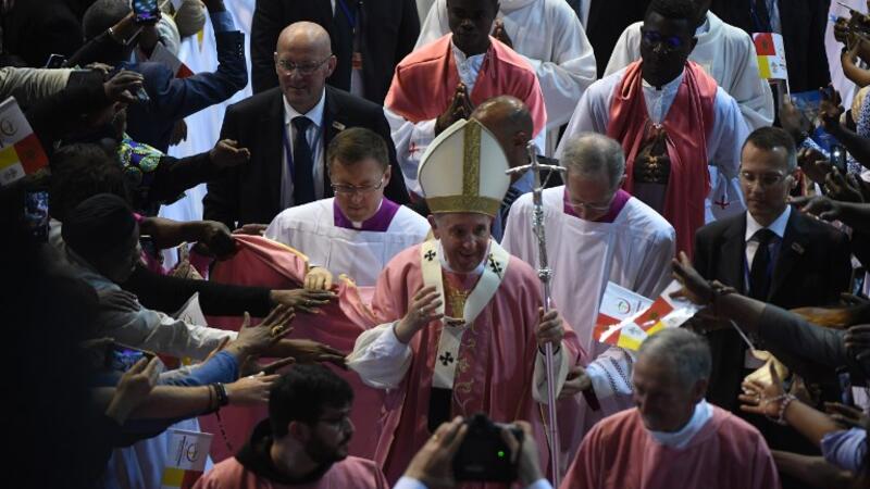 Worshippers reach out to Pope Francis (C) as he leaves the Prince Moulay Abdellah Sports Centre after celebrating a mass, in the Moroccan capital Rabat on March 31, 2019.