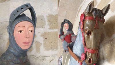The statue sits in an alcove at St. Michael's Church in Estella, depicting the saint in his typical warrior image -- wearing armor and astride a horse. The 16th century wooden statue was cracked and faded and had fallen into disrepair.