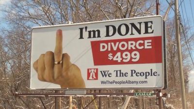 The We The People billboard, which advertises divorce services starting at $499, features a giant image of a hand with the wedding ring finger extended upward in a tongue-in-cheek reference to extending the middle finger.