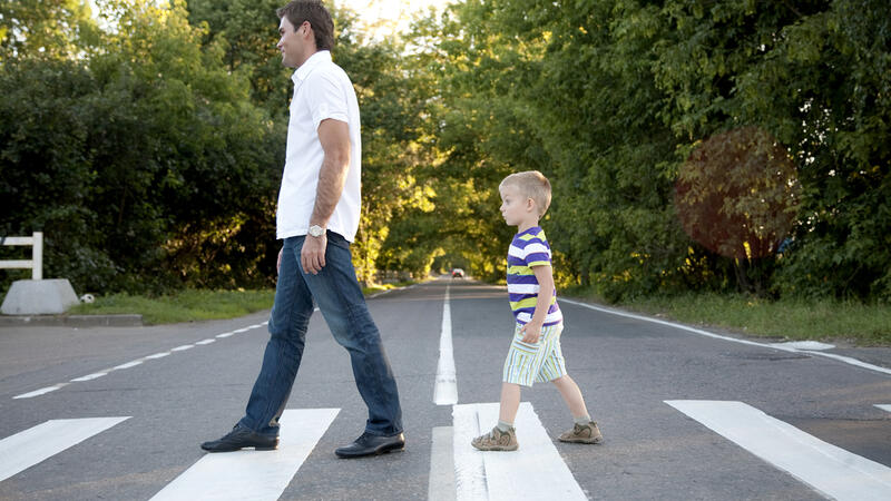 As his child starts to cross the second road, his father sees an oncoming vehicle and leaps to save his son.