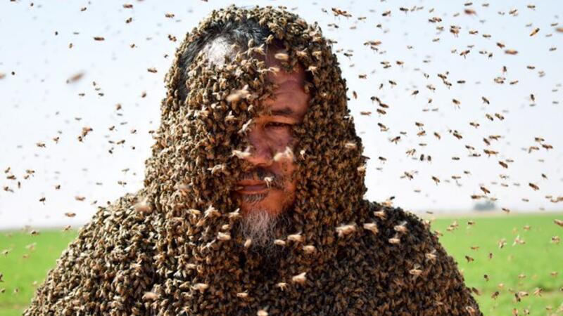 He carries a camera in his car at all times to record the moments when bees swarm his body, and said that the photos that have gone viral on social media were actually taken 12 years ago.