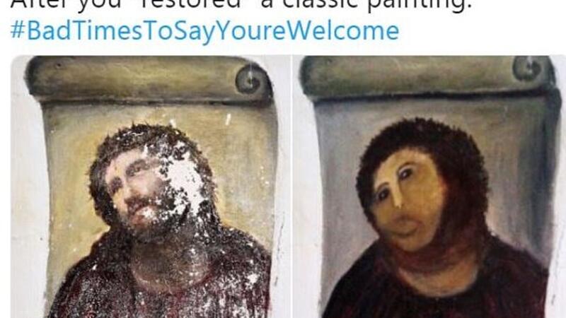 #BadTimesToSayYou'reWelcome: Twitter user @charley_ck14 tweeted a photo of a classic painting that received a tragic makeover, and racked up hundreds of likes (Twitter)