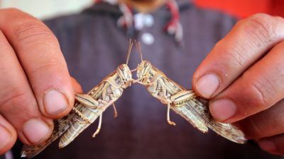 Adult locust swarms can fly up to 150km (93miles) a day with the wind and adult insects can consume roughly their own weight in fresh food per day. A very small swarm eats as much in one day as about 35,000 people, posing a devastating threat to crops and food security.