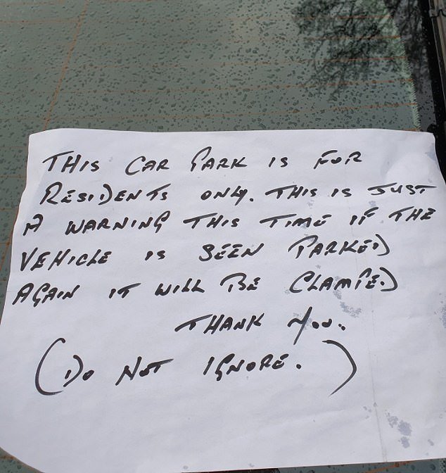 The note read: 'This car park is for residents only.
