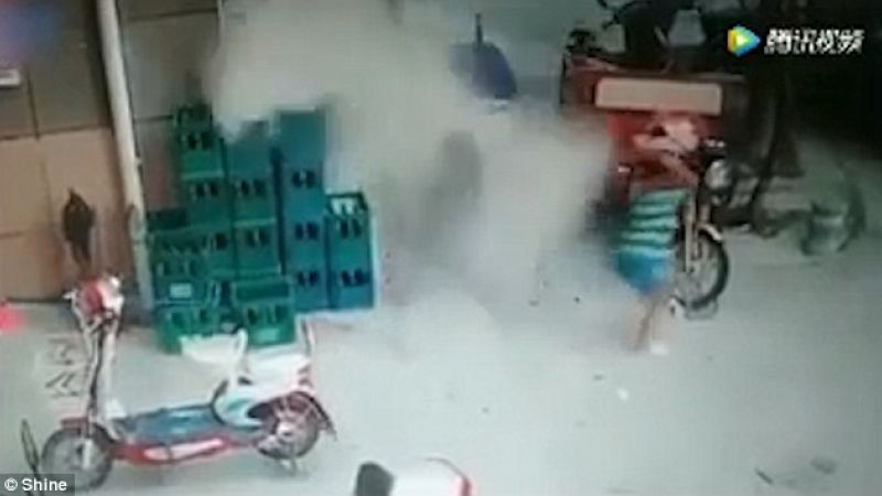 A boy in China had a narrow escape after huge chunks of concrete from a building fell inches away from him.