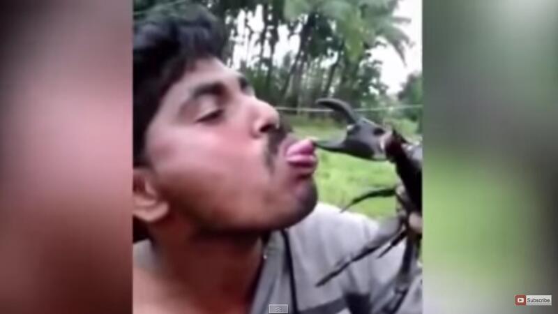The crab locks its jaws on Rao's tongue as he screams in pain.