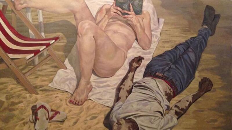 At the entrance of the hall, visitors are welcomed with the large portrait titled, Pimp, in which a women are featured seated desperately, with agonised gazes looking toward the ground, while a featureless alleged decent man is seated next to her on a couch in what seems to be a bathroom.