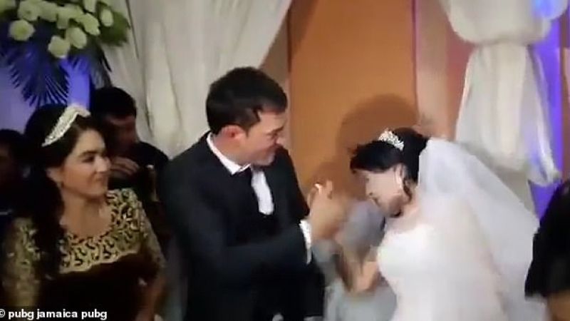 The clip, believed to have been captured in Central Asia, shows the groom angrily lashing out at his bride after she teased him by pretending to take his wedding cake away.