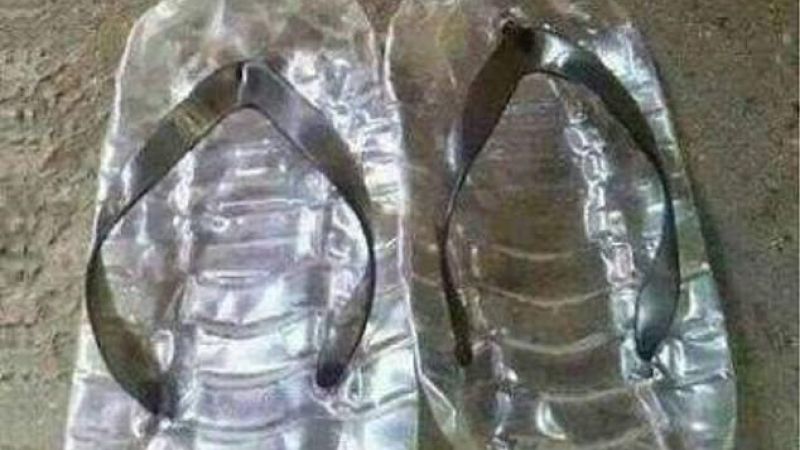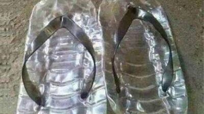 The so-called 'shoes' features two completely flat plastic bottles with straps attached to them, similar to a pair of thongs or sandals.