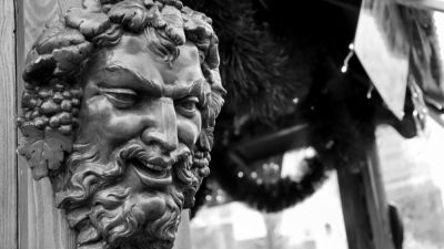 Bacchus (Dionysus) mask attached to the mulled wine stall at Christmas market in Paris (France). (Shutterstock/ File Photo)