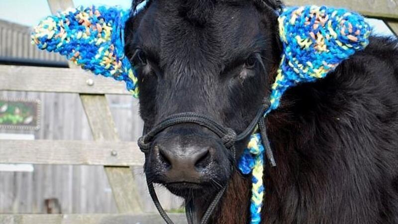A baby bull has become a local celebrity after he was sporting knitted ear muffs to help with his weak immune system.