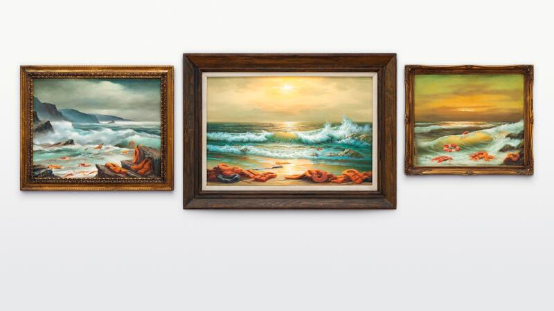 The work was based on three romantic-period oil paintings of the sea, and depicted life jackets, oars and other detritus on the shore from abandoned refugee boats — a comment on the mass movement of people from the Middle East and North Africa to Europe due to a series of ongoing natural and man-made events, including the wars in Iraq, Syria and Libya.