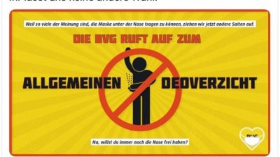 Commuters have been urged not to use deodorant in an outlandish campaign designed to encourage the use of facemasks on public transport in Berlin.