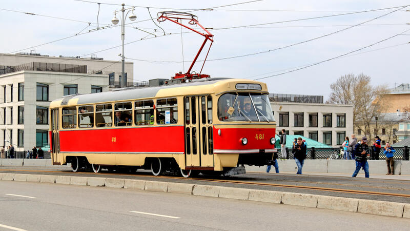 The footage shows the man loudly singing as he takes a free ride on the back of the tram.