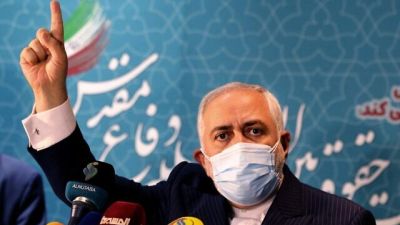 In this file photo taken on February 23, 2021, Iranian ex-Foreign Minister Mohammad Javad Zarif addresses the media at the International Conference on the Legal-International Claims of the Holy Defense in the capital Tehran (ATTA KENARE / AFP)